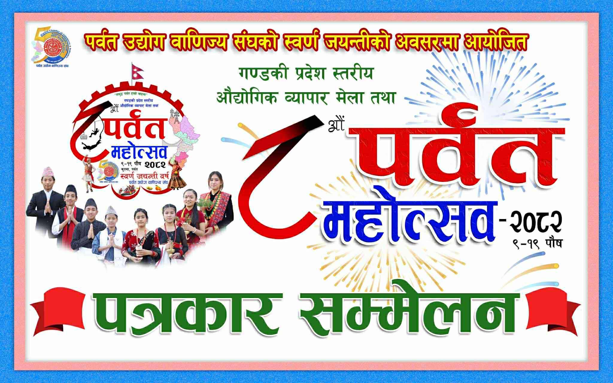 उद्योग वाणिज्य संघ पर्वतको आयोजनामा गण्डकी प्रदेशस्तरीय औद्योगिक व्यापार मेला ८ औं पर्वत महोत्सव–२०८२ हुने भएको छ । उद्यमहरुको प्रचारप्रसार प्रर्वद्धन र कला संस्कृतिको जगेर्ना गर्ने लक्ष्य सहित वाणिज्य संघको स्वर्णजन्मोत्सव वर्ष २०८२ को अवसरमा महोत्सवको आयोजना हुने भएको हो ।